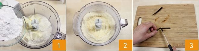 Para preparar las caritas de masa quebrada con chocolate y mermelada comenzad con la masa quebrada: en una batidora verted la harina, la mantequilla fría en trozos, una pizca de sal y el azúcar glas 1, luego triturad todo durante unos pocos segundos hasta obtener una mezcla arenosa 2. Volcadla sobre una superficie de trabajo dándole la clásica forma de fuente. Abrid la media vaina de vainilla y raspad con un cuchillito las semillas internas 3.
