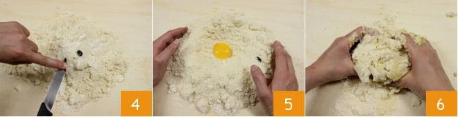 Añadid las semillas de vainilla en el centro de la fuente 4, agregad también la yema 5 y amasad brevemente 6.