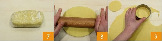 Formad un bloque y envolvedlo con film transparente 7 luego guardadlo en el frigorífico para que se endurezca durante al menos 30 minutos. Pasado el tiempo necesario, extendéis la masa quebrada en una lámina de ½ cm 8. Con un cortador de pasta circular de unos 10 cm de diámetro, sacad 8 figuras 9.