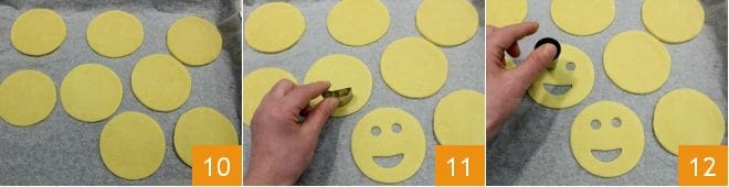 Colocad los discos en una bandeja cubierta con papel de horno 10, luego con un cortador de pasta en forma de cuarto de luna realizad en la mitad de ellos bocas sonrientes 11 (alternativamente podéis usar la punta de un cuchillito y recortar a mano la sonrisa), cread luego los ojos con un cortador de pasta de 2 cm de diámetro 12. El recorte de pasta en este caso os servirá para realizar la nariz de las caritas.