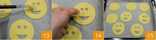 Pintad las caritas con un poco de agua entre los dos agujeros de los ojos y colocad la "nariz" (13-14); podéis hornear las caritas en horno estático precalentado a 180° por unos 15-20 minutos (si es horno ventilado a 160° por 10-15 minutos).