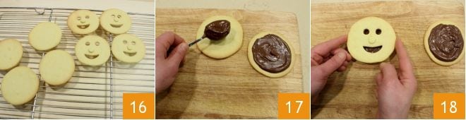 Una vez cocidas, sacadlas del horno y dejadlas enfriar completamente sobre una rejilla 16. En este punto rellenad 2 discos completos con Nutella 17 y colocad las caritas de masa quebrada 18.