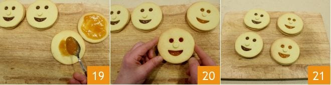 Podéis rellenar los otros dos discos restantes con mermelada 19 y cerrarlos con las caritas 20. ¡Servid las caritas de masa quebrada con chocolate y mermelada a vuestros niños para una alegre merienda 21!