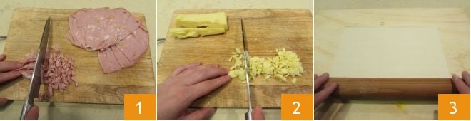 Para realizar los paquetitos de mortadela, empezad por la preparación del relleno. Con un cuchillo picad finamente tanto la mortadela 1 como el queso 2. Luego tomad el hojaldre y aplanadlo ligeramente con el rodillo 3.