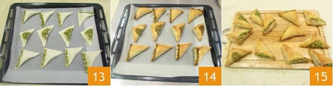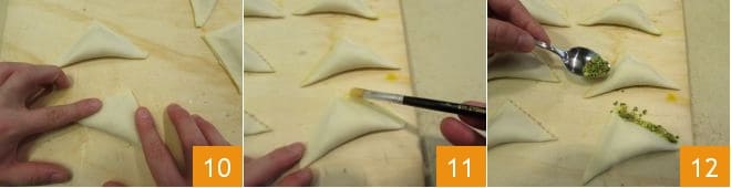 En este punto, cerradlos en forma de triángulo, presionando ligeramente con los dedos 10. Siempre con el huevo, untad los bordes y el centro de los triángulos 11 y añadid el granillo de pistacho para decorar vuestros paquetitos de mortadela 12.