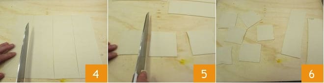 De aquí, sacad primero 4 tiras de unos 8x25 cm 4, y luego cortad de estas tiras rectángulos de aproximadamente 8x9 cm (5-6).