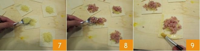 Colocad en el centro de cada rectángulo 1 cucharadita de queso 7 y 1 cucharadita de mortadela 8, picados previamente. Luego, con una brocha de cocina, untad los bordes del rectángulo con la yema ligeramente batida 9.