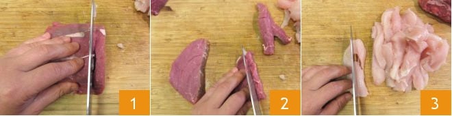 Para realizar las fajitas, lo primero que hay que hacer es preparar la carne: corta el lomo en rodajas 1, luego redúcelo a tiras 2 y haz lo mismo con la pechuga de pollo 3.