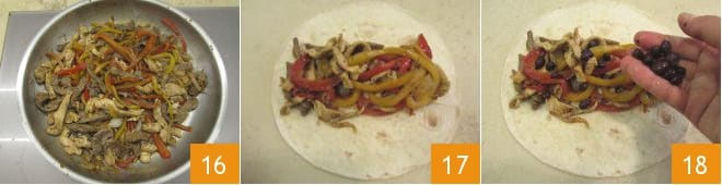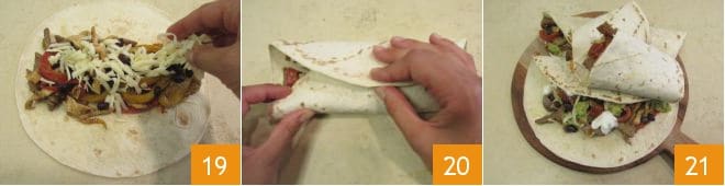 queso edam 19, salsa guacamole y Salsa de tomate mexicana. Cierra los bordes de la tortilla sobre el relleno 20 y disfruta de tus fabulosas fajitas 21!