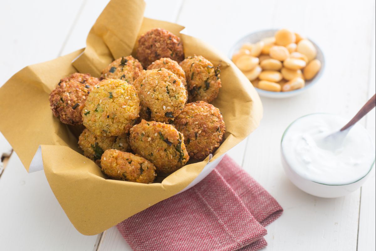 Típicos de la cocina de Oriente Medio, los Falafel de garbanzos (Felafel) son unas albóndigas especiadas a base de legumbres. La receta clásica incluye garbanzos secos, pero también es muy común la versión con Falafel de habas... hoy, en cambio, os explicamos cómo preparar los falafel de altramuces. Además de ser ricos en fibra, los altramuces cuentan con un importante contenido de proteínas, por lo que son un ingrediente particularmente valioso para quienes siguen una dieta vegetariana. A diferencia de los Cracker de altramuces, realizados con harina, esta vez hemos utilizado las semillas enteras que se trituran con los demás ingredientes para obtener un compuesto suave y moldeable, listo para sumergir en el aceite caliente. Servidos calientes y crujientes, los falafel de altramuces son ideales para acompañar con una salsa de yogur enriquecida con cáscara de limón y hojas de menta.