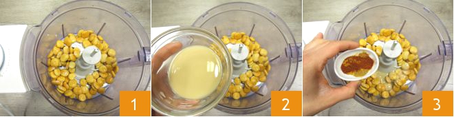 Para preparar los falafel de altramuces, coloca los altramuces con la piel en un procesador 1 junto con la tahina 2 y la mezcla de especias en polvo 3.