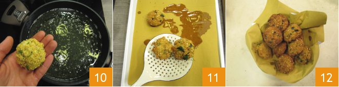 Calienta el aceite de semillas hasta una temperatura de unos 180° y fríe pocos falafel a la vez durante unos 3 minutos 10. Cuando estén bien dorados, escúrrelos sobre una hoja de papel para fritos 11 y ajusta de sal si es necesario. ¡Sirve tus falafel de altramuces bien calientes 12!
