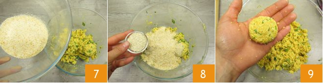 Mezcla bien con una espátula, luego incorpora el pan rallado 7 y las semillas de sésamo 8 y amasa con las manos hasta obtener un compuesto homogéneo. En este punto, forma los falafel: toma aproximadamente 30 g de masa cada vez, forma unas bolitas y aplánalas ligeramente 9. Puedes utilizar la herramienta adecuada, si la tienes.