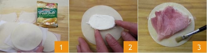 Para preparar la fantasía de hojaldres, empieza con los rollitos de jamón y mozzarella. Corta la mozzarella en 6 porciones. Saca los discos de masa del paquete 1, quita la película sobre la que reposan para colocarlos en una superficie de trabajo: coloca en el centro una rodaja de mozzarella 2 y, encima, una loncha de jamón doblada por la mitad. Humedece con agua los bordes del disco, ayudándote con un pincel de cocina 3.