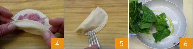 Cierra el disco de masa sobre sí mismo para obtener una media luna 4, que puedes sellar presionando los bordes con los dientes de un tenedor 5. Continúa hasta obtener 6 rollitos y colócalos en una bandeja cubierta con papel de horno. Continúa con los triangulitos de espinacas. Lava y seca las verduras, luego transfiérelas a una sartén rociada con aceite de oliva 6,