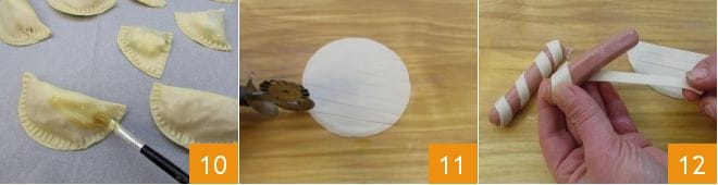 Coloca también los triangulitos en la bandeja junto con los rollitos de jamón y mozzarella, luego pincela la superficie de todos los hojaldres con un huevo batido 10. Déjalos a un lado y continúa con las mini salchichas. Coloca un disco de masa en la superficie de trabajo y córtalo en 6 tiras con un cortador de masa 11. Toma las 6 mini salchichas y envuelve cada una con una tira de masa, estirándola suavemente 12.