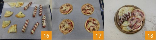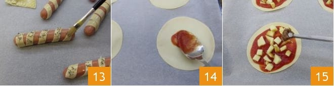 Coloca también las mini salchichas en la bandeja, luego pincélalas con el huevo batido y espolvoréalas con semillas de amapola 13. Hornea la bandeja en un horno estático precalentado a 200° durante 10 minutos (si es con ventilador, a 180° durante 8 minutos). Mientras tanto, prepara las pizzetas. Corta la scamorza en cubitos, luego coloca en una bandeja cubierta con papel de horno 4 discos de masa y vierte delicadamente en el centro una cucharada de salsa de tomate, dejando libres los bordes 14. Condimenta las pizzetas con los cubitos de scamorza y en cada una coloca una anchoa cortada por la mitad 15.