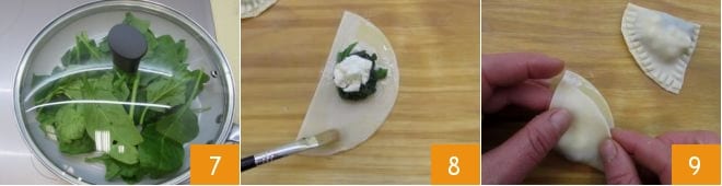 cúbrelas con una tapa 7 y cocina las espinacas durante 3-4 minutos. Corta la feta en cubitos. Ahora coloca 3 discos de masa en la superficie de trabajo y divídelos por la mitad para obtener 6 triangulitos. En cada porción de masa coloca un montoncito de espinacas y, encima, un cubito de feta. Pincela los bordes con agua o con un huevo batido, ayudándote con un pincel de cocina 8. Dobla ahora cada mitad sobre sí misma y presiona sus bordes con un tenedor para sellarlos 9.