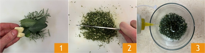 Para preparar la gallina de Guinea al horno, primero pica finamente 2 dientes de ajo pelados, una ramita de romero y 3 hojas de salvia 1 2. Transfiere todo a un bol y sazona con aceite 3.