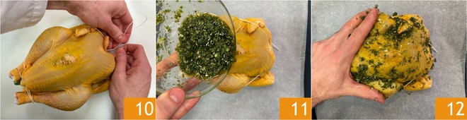 Pasa el cordel alrededor de las alas y anúdalo en la parte superior 10, de esta manera, la gallina de Guinea mantendrá su forma durante la cocción. Coloca la gallina en una bandeja de horno cubierta con papel de hornear, vierte las hierbas picadas sobre la gallina de Guinea 11 y masajea la carne 12 para distribuir las hierbas por toda la superficie. Hornea en horno ventilado, precalentado, a 180°C durante 20 minutos.