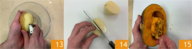 Mientras tanto, pela las patatas 13 y córtalas en gajos 14. Elimina las semillas y los filamentos internos de la calabaza 15.
