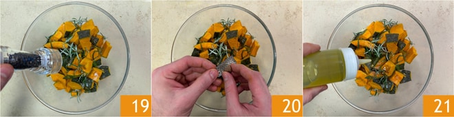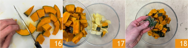 Luego córtala en cubos de 3 cm 16. Transfiere las patatas y la calabaza a un bol 17, luego sazona con romero 18.