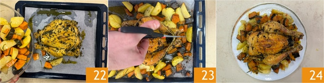 Añade las verduras a la bandeja, junto con la gallina de Guinea 22, corta el cordel 23 y continúa la cocción con el mismo método durante otros 40 minutos. Retira del horno, deja reposar la gallina de Guinea durante 10 minutos, luego emplata. ¡Tu gallina de Guinea al horno está lista para ser servida 24!