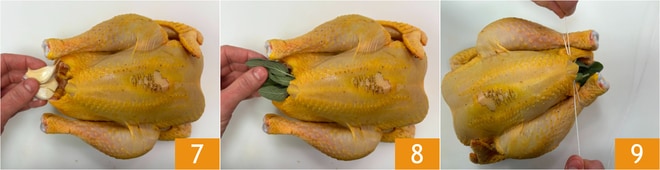 Rellena la gallina de Guinea con otros dos dientes de ajo machacados 7, tres hojas de salvia 8 y una ramita de romero. Ata las patas de la gallina de Guinea con cordel 9.