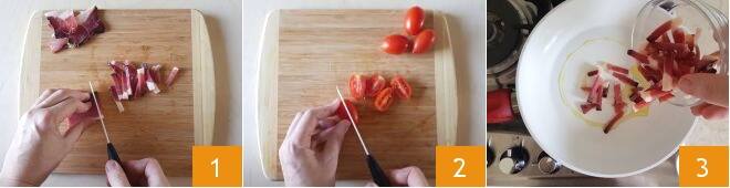 Para preparar las farfalle con crema de parmesano, speck y pistachos empieza cortando el speck en tiras de aproximadamente 0,5 cm 1; lava, seca y corta los tomatitos en 8 partes 2. En una sartén amplia añade un chorrito de aceite, incorpora el speck 3 y deja dorar por unos instantes.