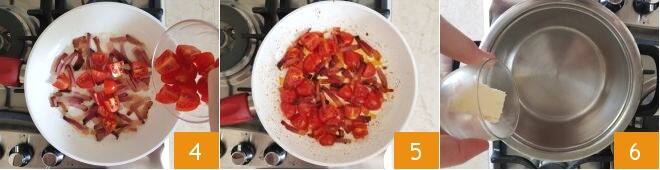 añade los tomatitos 4 y cocina a fuego medio por algunos minutos. Tan pronto como los tomatitos estén marchitos apaga el fuego 5. Pon al fuego una olla con abundante agua para salarla cuando hierva, servirá para la pasta. Mientras tanto prepara la crema de parmesano. Coloca la mantequilla en una cacerola 6,