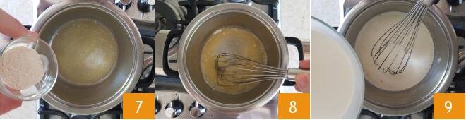 déjala derretir a fuego muy bajo, añade la harina 7 y mezcla con una varilla hasta obtener una crema suave 8, añade la nata 9,
