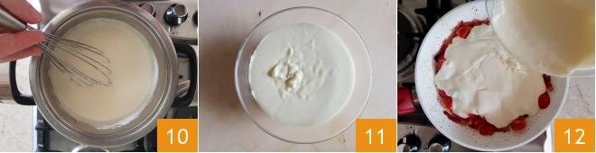 ajusta de sal y deja espesar a fuego medio-bajo mezclando continuamente con la varilla (unos 5 minutos) 10; cuando la mezcla se haya vuelto cremosa apaga el fuego y añade el parmesano rallado. Mezcla bien para obtener una crema lisa y homogénea 11. Incorpora la crema de parmesano al speck y tomatitos 12,