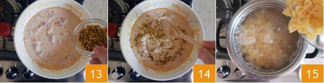 mezcla y añade la granilla de pistachos (deja 10 g aparte para la decoración final del plato) 13, mezcla de nuevo 14 y vuelve a poner al fuego a llama muy baja. Cuece las farfalle un minuto menos del tiempo indicado en el paquete 15
