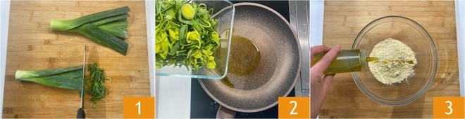 Para preparar la farinata de puerros, lo primero que debes hacer es lavar bien la parte verde del puerro y cortarla en rodajas 1. En una sartén vierte un poco de aceite 2, agrega el puerro y cocínalo durante unos 5 minutos, añadiendo un poco de agua. Mientras tanto, prepara la farinata. En un bol, vierte la harina de garbanzos y 3 cucharadas de aceite 3.