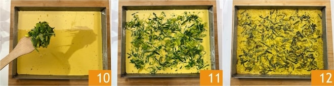 Añade las hojas de puerro encima 10, dispersándolas bien por toda la superficie 11. Cocina en horno estático precalentado a 220° durante unos 30 minutos. Saca del horno y sirve la farinata caliente o tibia.