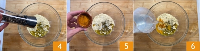 Añade sal, pimienta 4 y medio cucharadita de cúrcuma 5. Vierte el agua lentamente 6, mezclando con una batidora de varillas.