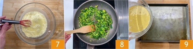 Debes obtener una mezcla sin grumos, bastante líquida 7. En este punto, los puerros estarán bien salteados, apaga el fuego 8. Transfiere la mezcla para la farinata dentro de una bandeja de 28x35 cm previamente engrasada 9, de modo que obtengas un grosor de medio cm.