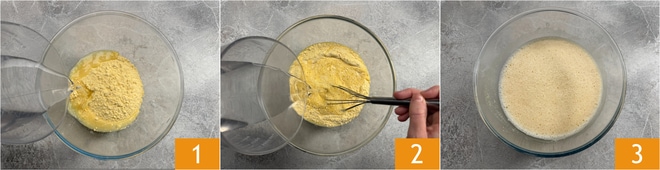 Para preparar la farinata de agretti, la noche anterior pon la harina de garbanzos en un bol, vierte el agua a temperatura ambiente 1 y mezcla con unas varillas 2. Cubre con film y deja reposar en el frigorífico durante 8-12 horas 3.