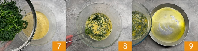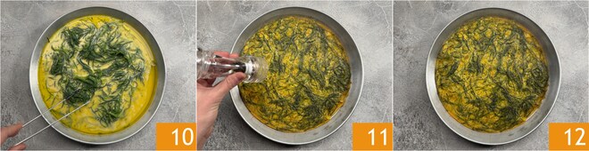Recupera la masa de garbanzos y, con una espumadera, elimina la espuma que se formará en la superficie, luego mezcla cuidadosamente. Añade el aceite, la sal y los agretti 7. Mezcla una vez más 8. Engrasa generosamente una bandeja de aluminio de 32 cm de diámetro y vierte en su interior la mezcla 9.