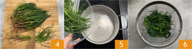 Cómo limpiar y cocinar los agretti eliminando la base coriácea y terrosa 4. Escáldalos durante 3 minutos en agua hirviendo con sal 5. Escúrrelos y reserva 6.