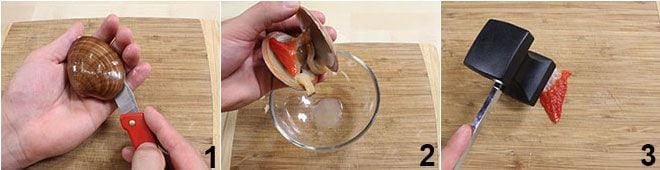 Para preparar los fasolari gratinados, abrid los fasolari en crudo 1, recoged su agua durante la apertura 2, desprendedlos de las conchas, que reservaréis, y golpead los moluscos con un mazo de carne 3.
