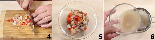 Sobre una tabla de cortar con un cuchillo, picad gruesamente los fasolari y guardadlos en un bol (4-5). Filtrad el agua recogida 6 y reservad todo.