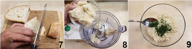 Ahora dedicáos al relleno: quitad la corteza del pan y cortad la miga en trozos 7. Colocad la miga en un procesador de alimentos y trituradla, luego mezcladla con el perejil picado 9.
