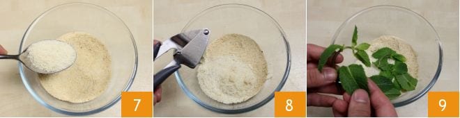 Mientras tanto, preparad el relleno de hierbas: en un bol pequeño poned el pan rallado, agregad el Grana Padano rallado 7. Luego añadid el diente de ajo picado 8 y desmenuzad con las manos las hojas de menta 9.