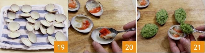 Luego lavad las conchas de los fasolari y dejadlas secar sobre un paño de cocina 19. Dividid la concha en dos mitades y llenad cada caparazón con los fasolari picados 20 y luego con una cucharadita de relleno 21.