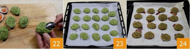 Llenad cuidadosamente cada concha 22, luego colocad los caparazones rellenos en una bandeja para hornear forrada con papel pergamino 23. Coced en horno estático precalentado a 200° durante 25 minutos (si es ventilado a 180° durante 15-20 minutos). Pasado el tiempo necesario activad el grill durante 5 minutos para obtener una superficie crujiente. Luego sacad del horno vuestros fasolari rellenos de hierbas 24 y ¡servidlos bien calientes!