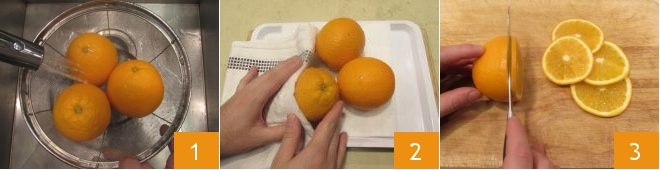 Para realizar las rodajas de naranjas secas, lava las naranjas bajo el agua corriente 1, luego sécalas 2 y córtalas en rodajas de 5 mm de grosor 3, deberás obtener unas 14 rodajas.