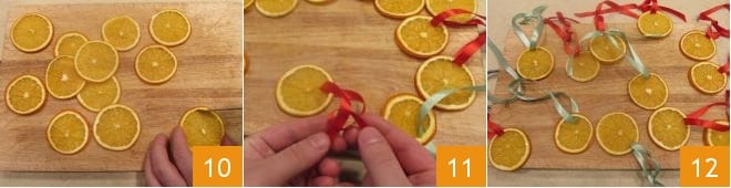 y en cada una realiza, con un cuchillo pequeño, una pequeña incisión en la corteza 10, por esta abertura pasa el lazo de raso de color 11, átalalo para crear un pequeño lazo. ¡Tus rodajas de naranjas secas están listas para ser colgadas en tu árbol 12!