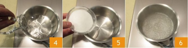 Prepara el jarabe: en un cazo vierte el agua 4 y el azúcar 5, calienta el jarabe hasta que esté a punto de hervir 6, luego apaga el fuego y transfiérelo a un cuenco.