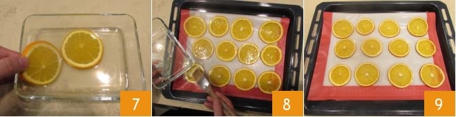 Sumérge cada rodaja de naranja en el jarabe de azúcar 7. Transfiere las rodajas de naranja a una bandeja forrada con papel de horno o una alfombrilla de silicona específica para la cocción en horno 8. Seca las rodajas en un horno estático precalentado a 100°C durante 2 horas manteniendo la puerta del horno entreabierta. Luego deja secar las rodajas durante otras 8 horas en el horno apagado y entreabierto. Una vez transcurrido el tiempo indicado, saca las rodajas de naranjas 9.